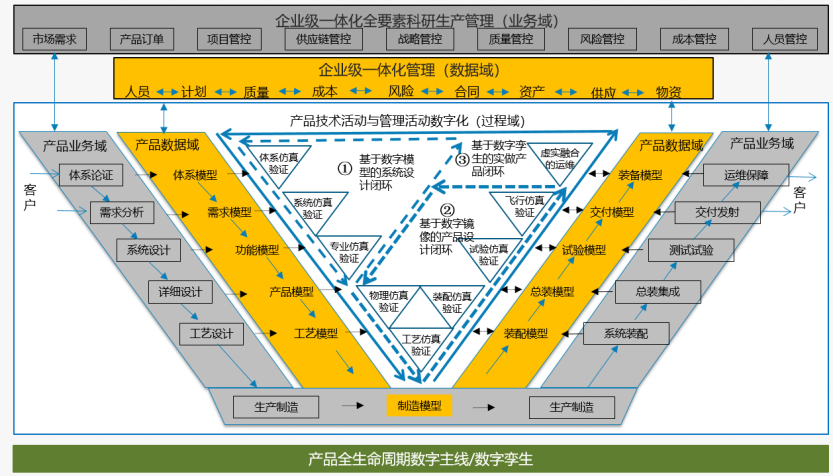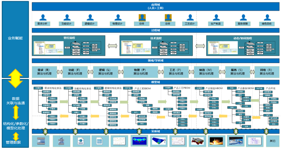 从以文档为中心向模型数据驱动的研制模式转型,重点是构建实物产品的数字产品空间。利用产品数字化、过程数字化、规则数字化技术,形成产品数据域、过程域和业务域的融合,支持全生命周期模型体系管理,以及全生命周期技术和管理活动,逐步形成模型数据驱动的数字化研制过程。PLM作为管理产品所有资产并有效协同各利益方的基础系统,是研制模式变革的直接支撑。