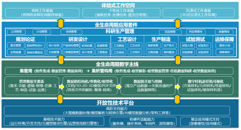 结合工程需求,甄选、评估工程所需的自主工业软硬件生态伙伴,以PLM系统为牵引,联合打造适合工程需要的构件化、组合式应用,并具备适应业务变化的“快、灵”技术能力,支撑研制范式变革的动态性、长期性,为总体、分系统和配套单位提供实用、好用的个性化解决方案。