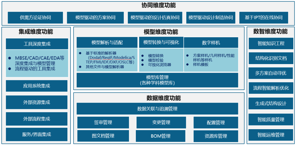 PLM系统能力构成包括集成维度、数据维度、模型维度、协同维度和数智维度的功能集。